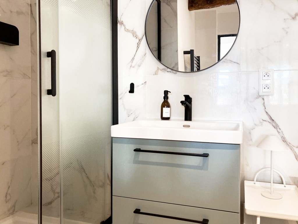 La salle d’eau est habillée de panneaux imitant le marbre, renforçant l’impression de luxe et de propreté.
