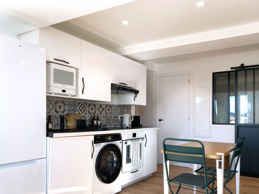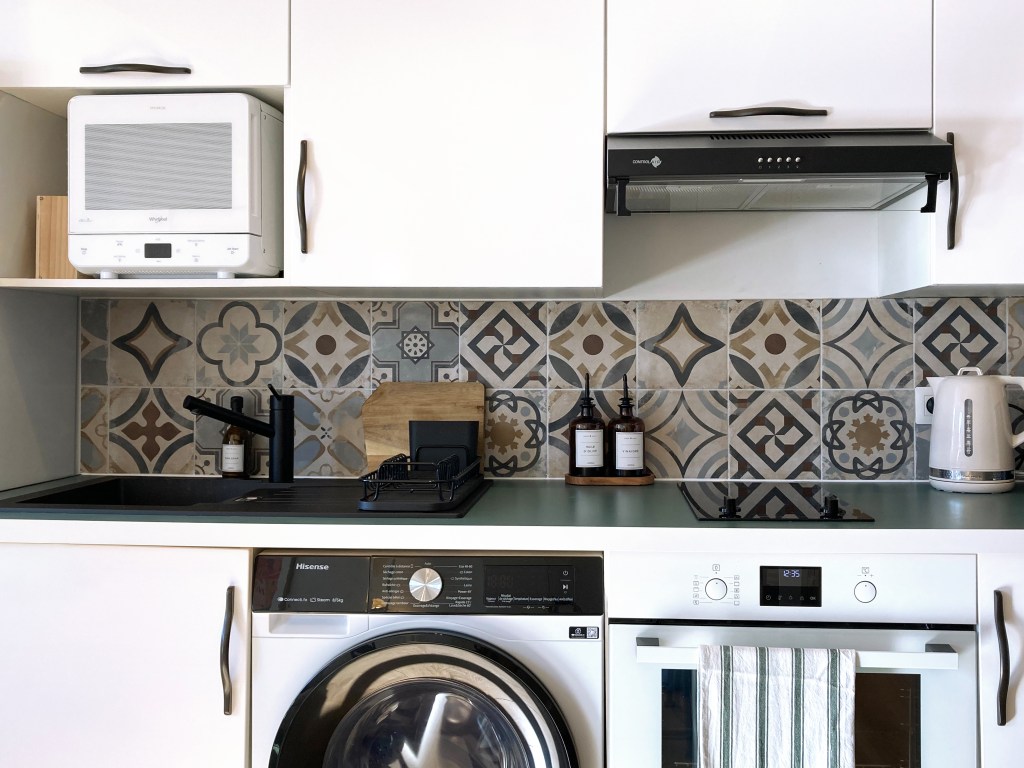 La cuisine, entièrement équipée, allie praticité et esthétisme avec des meubles blancs laqués et un plan de travail vert foncé. Les appareils électroménagers intégrés et les accessoires soigneusement choisis s’intègrent parfaitement dans cet espace lumineux.