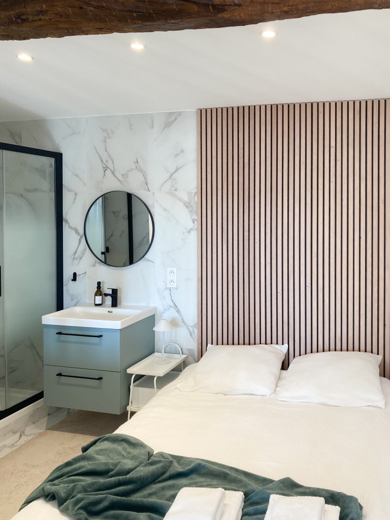 Pour marquer une séparation subtile et élégante entre l’espace chambre et la salle d’eau, un panneau décoratif en bois a été installé au niveau de la tête de lit sur toute la hauteur. Le lit double, habillé de linges blancs et de couvertures douces dans des tons vert, invite à la détente.